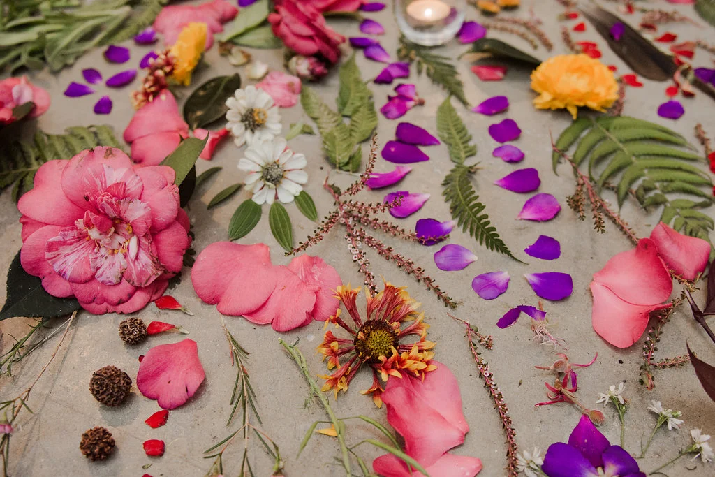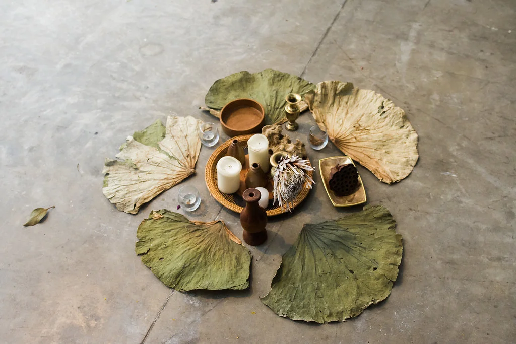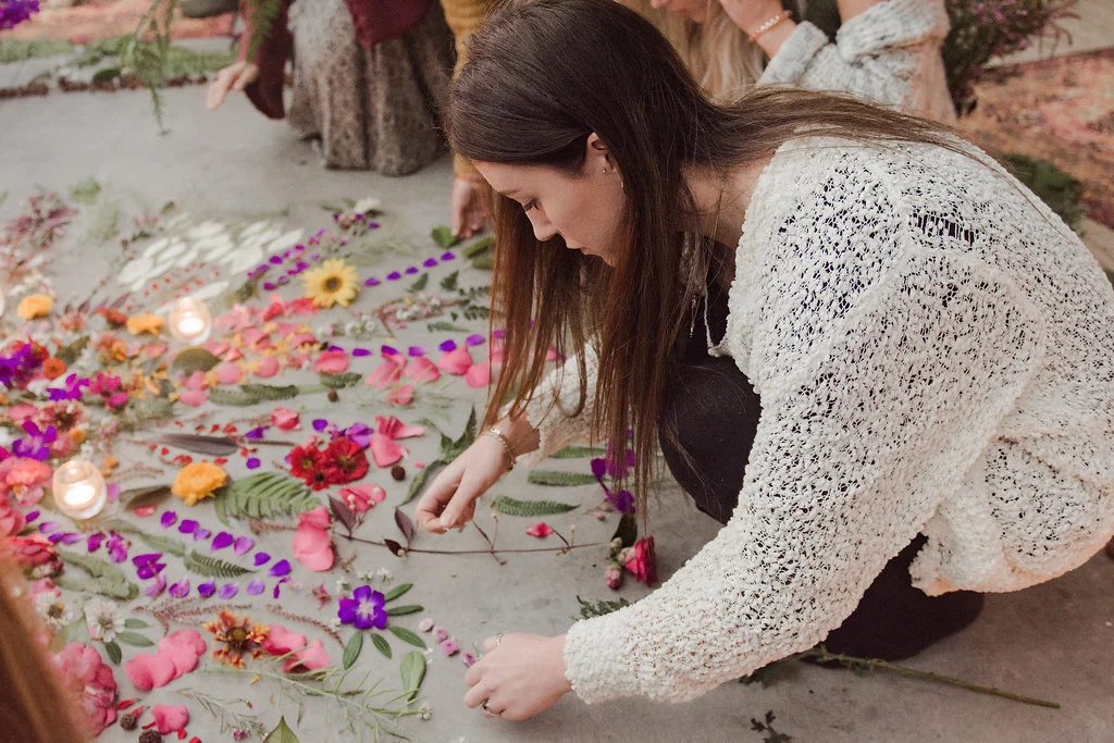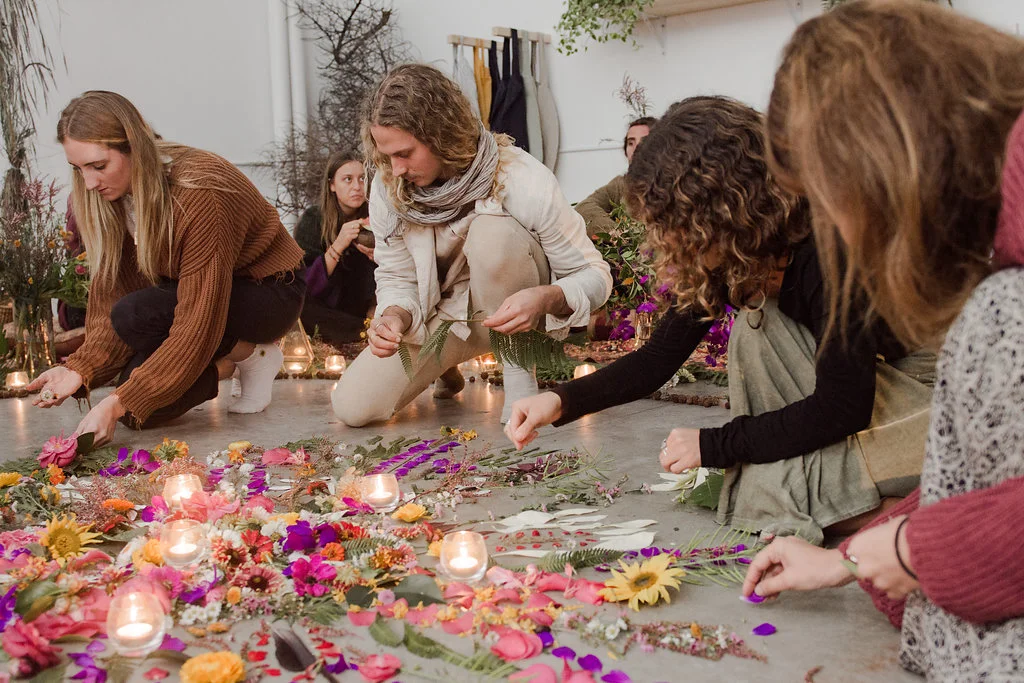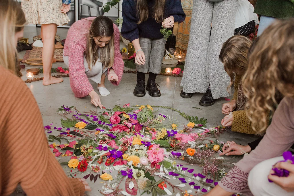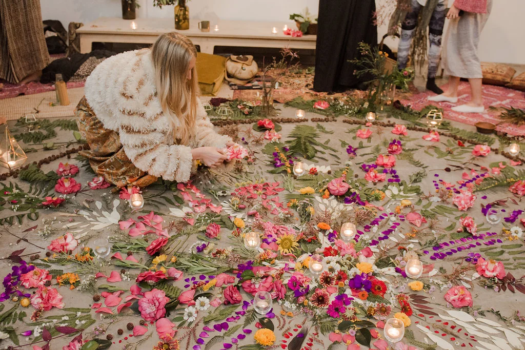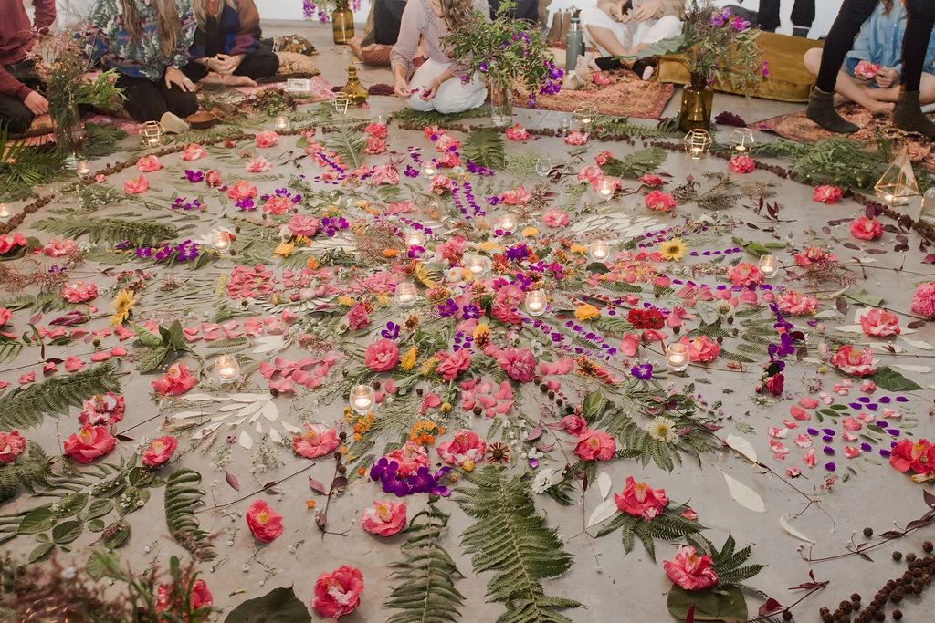 The evening started with some talks and knowledge sharing and ended in ritual. The sporadically placed urns of flowers were not just decor but the foliage for the collective creation of a mandala. Attendees were invited to take items from the vases and place them into the mandala. This practice was carried out in silence to dim candle light over around 30 minutes. The end result; a vibrant, intricate mandala creation collectively designed by the participants.