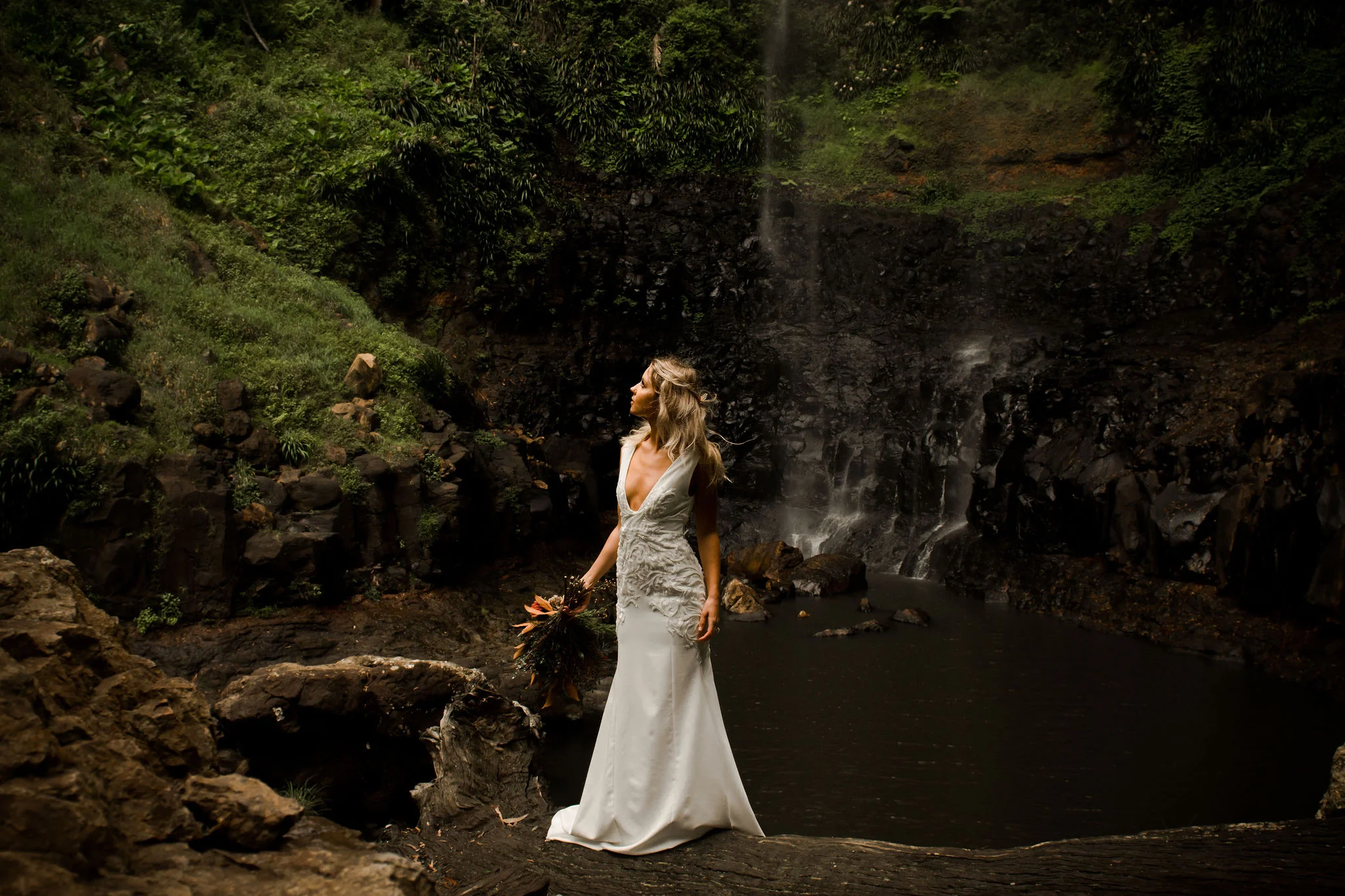 This shoot was epic! When we arrived at the national park car park the weather was looking ominous, but we decided to push on anyhow. About 15 minutes into our 2 hour trek we were hit with heavy rain, but determined we pushed on. We trekked through the rainforest saddled with wedding garments, makeup and camera gear to emerge soggy but excited at the base of the waterfall to find the perfect shoot conditions.